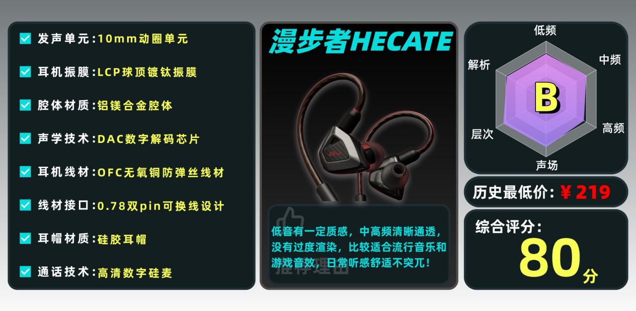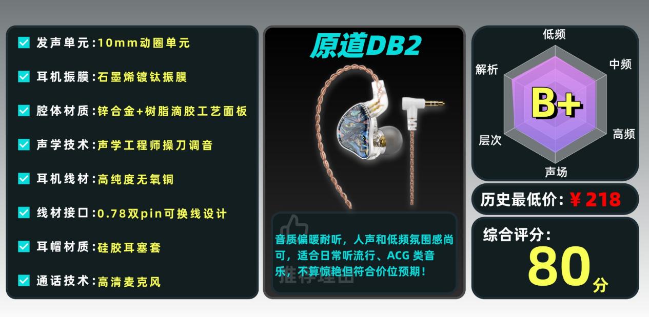 10mm 石墨烯镀钛动圈 + 隐藏式动铁的一圈一铁组合,4 张气压阻尼片加持,原线直推调音偏暖。低频量足泛音丰富,流行乐底鼓表现尚可,中频人声自然齿音控制佳。高纯度无氧铜线偏软偏细,需避免拉扯,0.78mm 双针可换线可玩性高,线控操作便捷。塑料腔体做工规整,但耐用性一般。