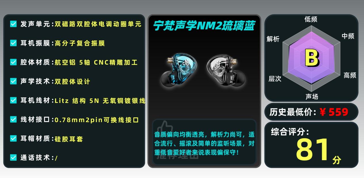 搭载双 12.5mm 双向推挽式动圈单元,采用高纯度无氧铜线材减少信号损耗。声学上侧重监听级清晰度,中频人声还原扎实,细节表现到位,高音清亮不刺耳,易推性强,但低频下潜不足,弹性一般,纵向声场较窄。