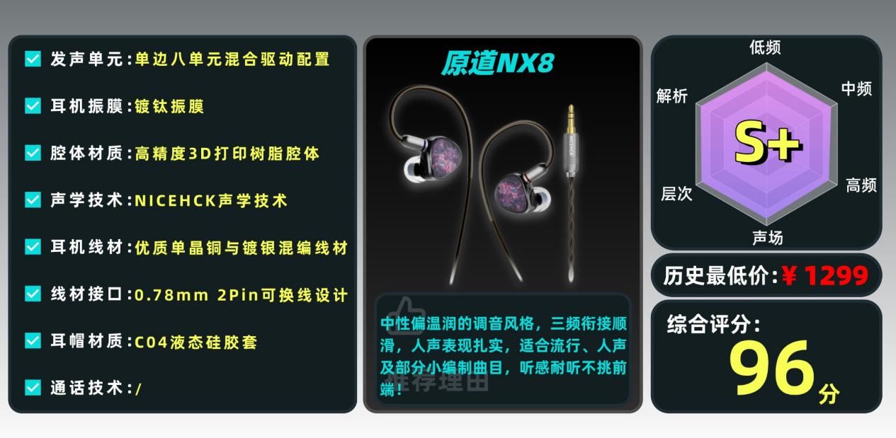 搭载 10mm 镀钛振膜动圈 + 6 动铁 + 1 压电陶瓷的八单元配置,采用自制电子分频技术,三频衔接顺滑。低频量感充足、回弹干净,中频温暖饱满,高频顺滑不刺耳。