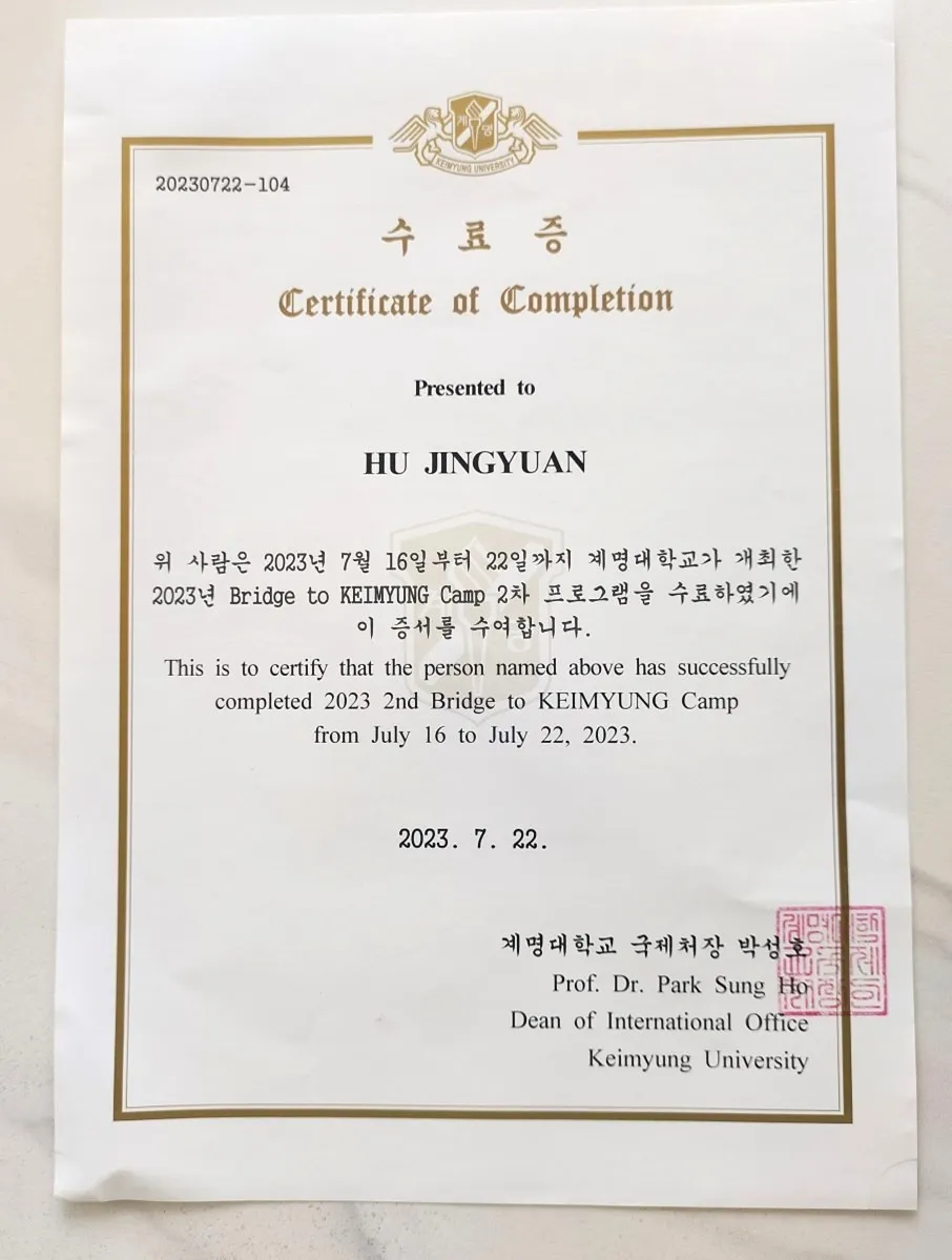 韩国启明大学为广州华立学院访学学生颁发的证书