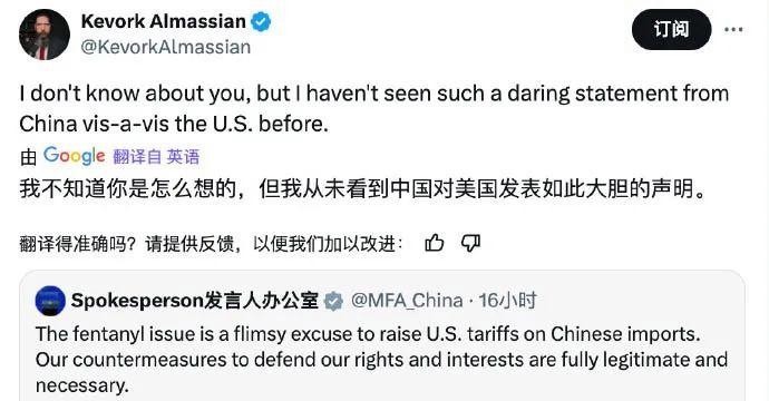 近期,美国再度以“芬太尼危机”为借口,对中国进口商品关税一提再提,从10%飙升至20%。面对这一挑衅,中国毫不示弱,迅速反击,宣布对一系列美国农产品实施10%至15%的额外进口关税,同时祭出大招,将25家美国企业纳入出口与投资限制的黑名单。这一系列动作,不仅彰显了中国捍卫自身利益的坚定决心,也让世界见证了东方大国的崭新风采!