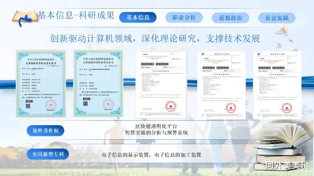 2024年6月,在大学生信息系统创新大赛开发者算法编程挑战赛中获得优秀奖。并获得软件著作权:区块链透明化平台智慧交通的分析与预警系统,实用新型专利:电子信息的显示装置,电子信息的加工装置。
