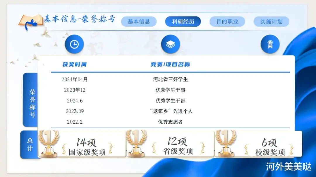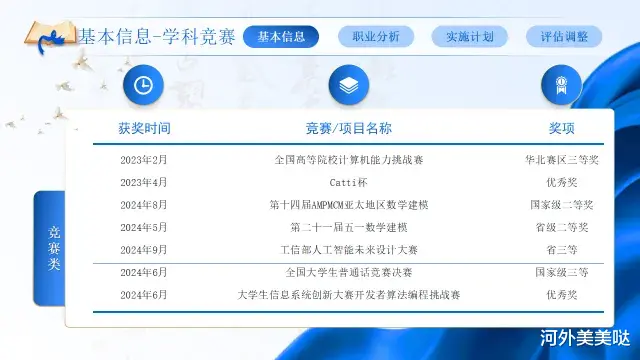 2023年4月,在Catti杯竞赛中获得优秀奖。2024年8月,在第十四届AMPMCM亚太地区数学建模竞赛中获得国家级二等奖。