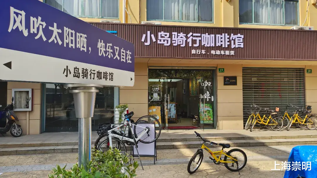 出了横沙码头,向前走几百米,就能看到一家“小岛骑行咖啡馆”。店外,多款式自行车整齐摆放;店内,各种骑行元素也十分吸睛。