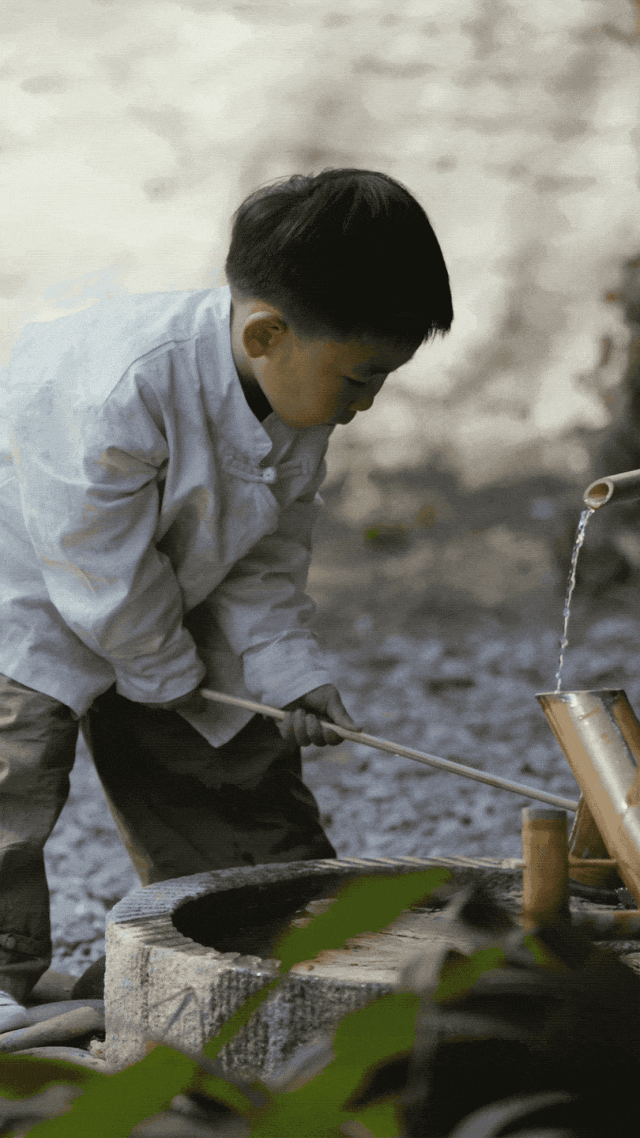 小朋友在水池边玩水,用竹子作为金箍棒大显身手;隔壁家的奶奶坐在小椅子上安静地晒着太阳。自从房子建成以后,村民就特别喜欢来串门。