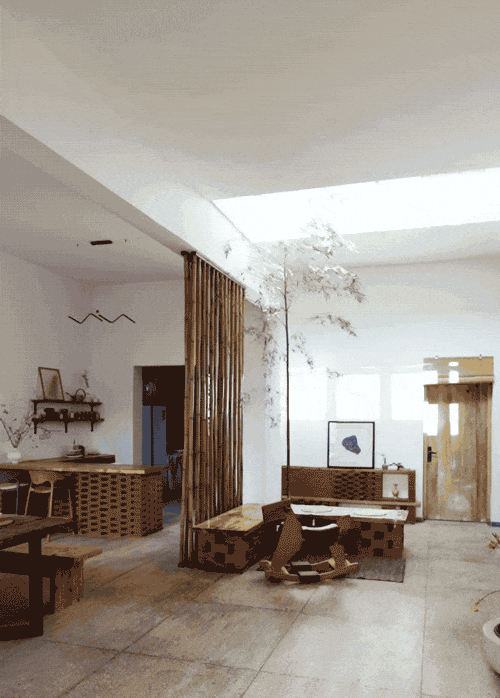 天井的植入,也让空间的划分更加明确。我用竹子做了一个小隔断,一边是餐厅、吧台和厨房,一边是天井下面的会客区域。