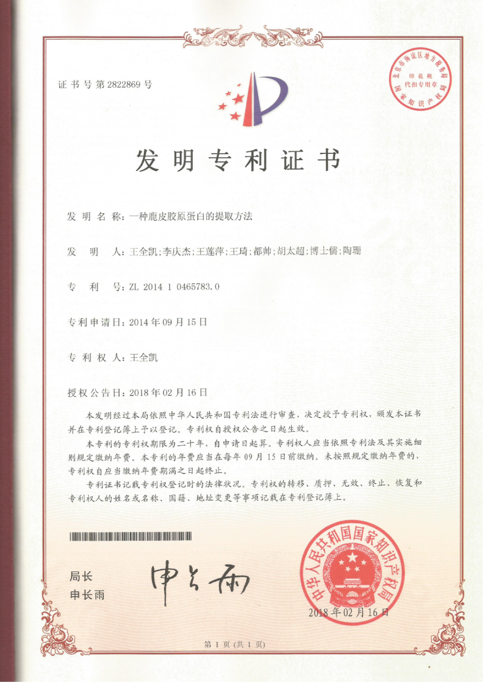资生活食品研究院坚持多年的基础科学研究投入,对科研成果进行实验验证和生产转化,在产学研衔接和转化方面取得长足进步,特别是近期对动物蛋白小分子活性肽的生产工艺研究取得突破,即将完成工厂化生产的前期工艺验证,达到上市条件。动物蛋白小分子活性肽的生产工艺已经取得国际专利,具有全球独家生产和经销的权利保护。