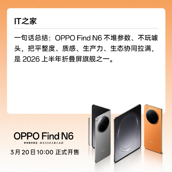 当然,除了平整的屏幕外,OPPO Find N6在诸多方面都有明显升级,比如哈苏2亿超清四摄、满级防水、全景自由窗等等这些配置和功能的加持,让OPPO Find N6在影像、耐用性以及功能性上有着极佳的表现,也因此Android Headlines直接为OPPO Find N6给出了“定义 2026 年折叠屏黄金标准”的超高评价。