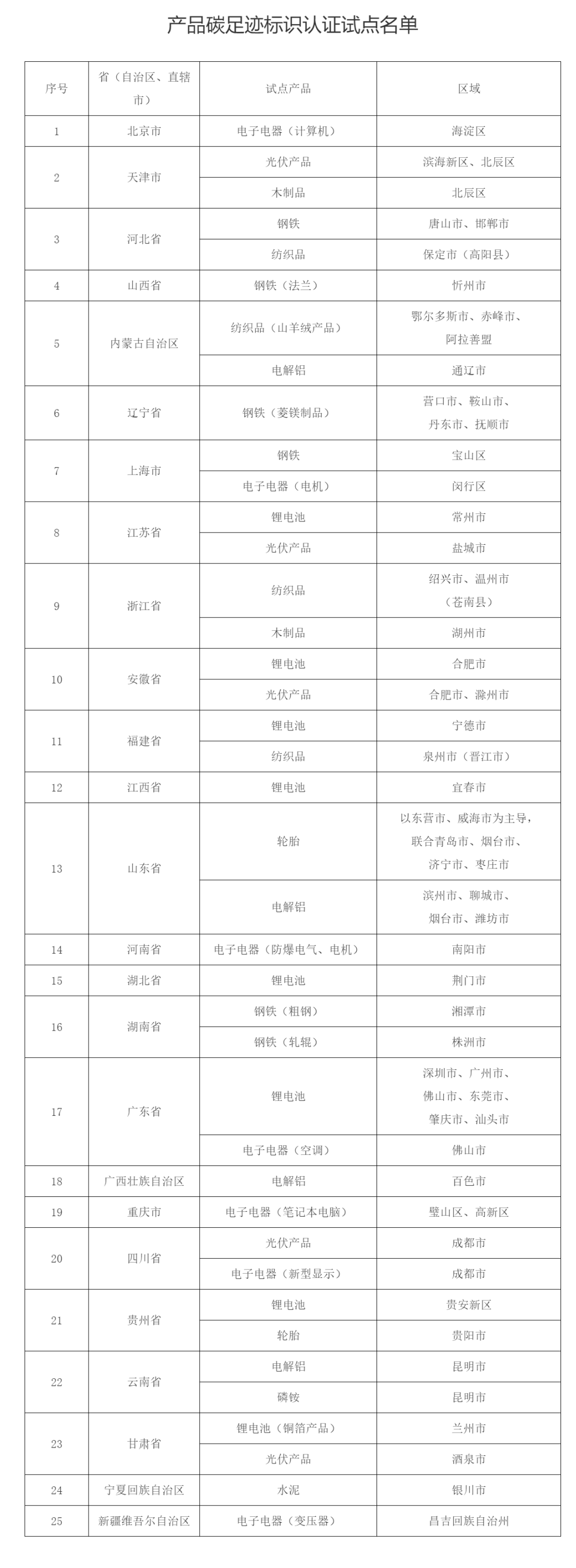 根据《市场监管总局等部门关于开展产品碳足迹标识认证试点工作的通知》(国市监认证发〔2024〕85号),经自愿申报和专家技术评审,现公布产品碳足迹标识认证试点名单(见附件)。