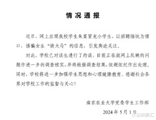 南京农业大学5月1日发布情况通报:近日,网上出现我校学生朱某冒充小学生,以招聘陪玩为借口,诱骗女生“骑大马”的信息,引发舆论关注。