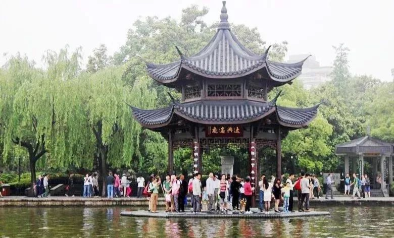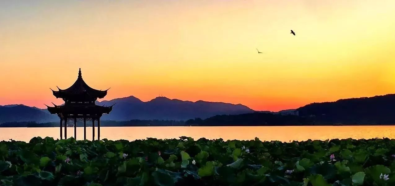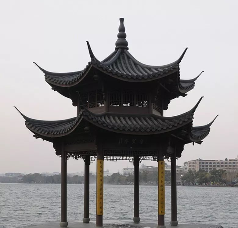 在湖滨一公园的转弯处,有一片空旷的水域,蛰伏着田田的荷叶,伸出短堤挑出一亭,双重檐、攒尖顶、六根木柱支撑,建造得异常轻捷、通透,有如点睛一笔,把远山近水的气场都聚拢一起,古称聚贤亭、较射亭,今曰集贤亭,是西湖上的标志型建筑之一,也是摄影爱好者最热打卡点之一。