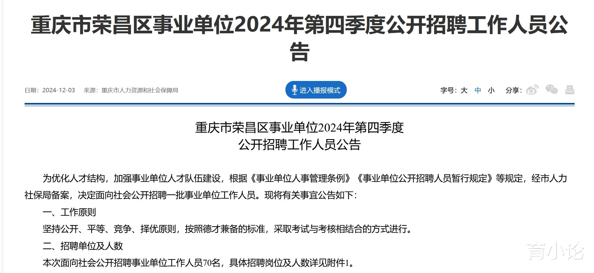 近日,重庆市人社局官网发布《重庆市荣昌区事业单位2024年第四季度公开招聘工作人员公告》,面向社会公开招聘事业单位工作人员70名。