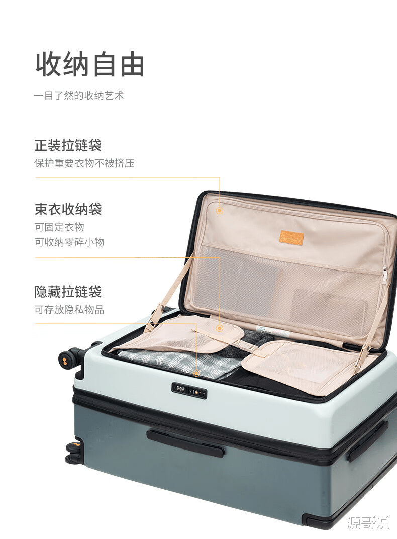 嗯!行李箱内部正装拉链袋(即浅仓),即可放笔记本电脑、充电宝、一些重要的证件以及一些重要衣物,让这些物品不被挤压。深仓两个束衣收纳袋,即可固定衣物,也能收纳零碎小物。而隐藏拉链袋,则可以存放隐私物品。真的方便衣物、电子产品等各类物品进行分类整理。