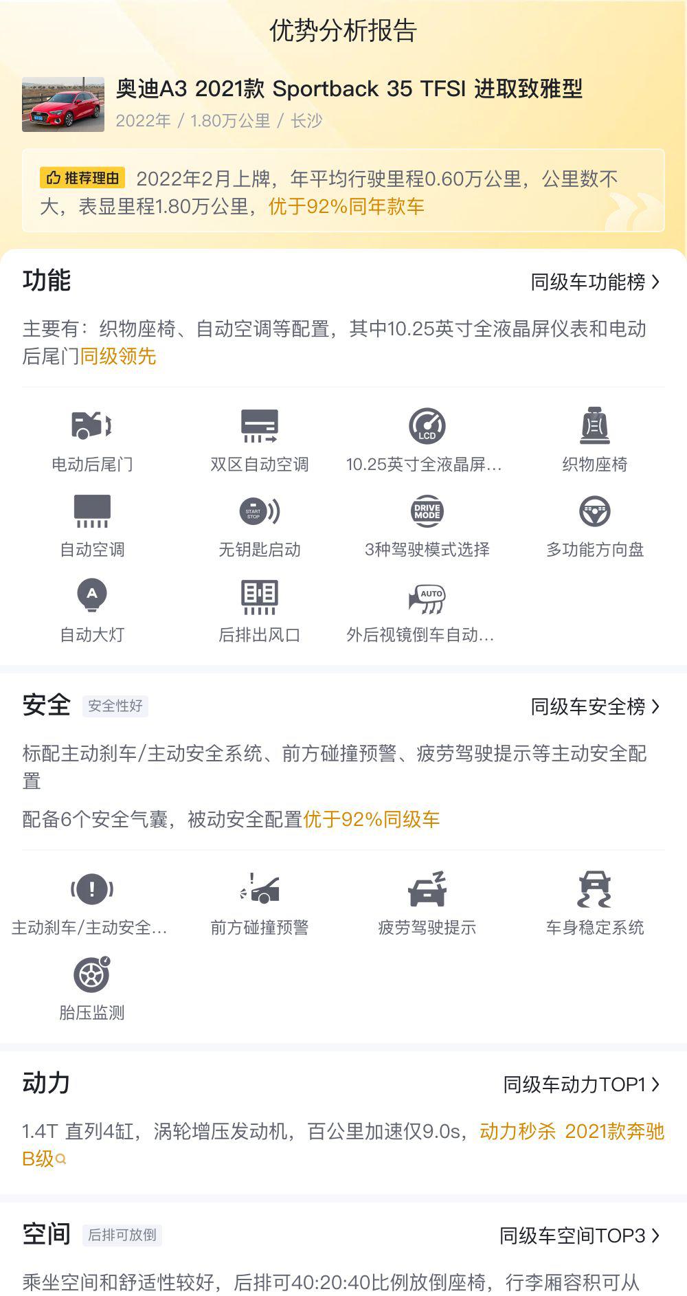 说完了车况、性能和配置,我们再来聊聊价格。目前,2021款奥迪A3 Sportback 35 TFSI 进取致雅型的二手车市场价大概在10-15万之间,具体价格会受到车况、里程、地区等因素的影响。10.98万的价格,相比新车价确实很有吸引力,但也要警惕价格过低的情况,俗话说“便宜没好货”,过低的价格背后可能隐藏着一些问题。