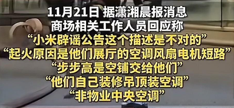 就在小米的回应试图厘清舆论认知之际,商场运营方步步高的工作人员却给出了截然不同的说法。步步高方面直言小米的辟谣公告“描述不对”,并还原核心事实:商场是以空铺形式交付小米使用,展厅内的吊顶装修及空调设备均由小米自行安装,起火根源实为小米展厅内的空调风扇电机短路,与物业中央空调毫无关联。