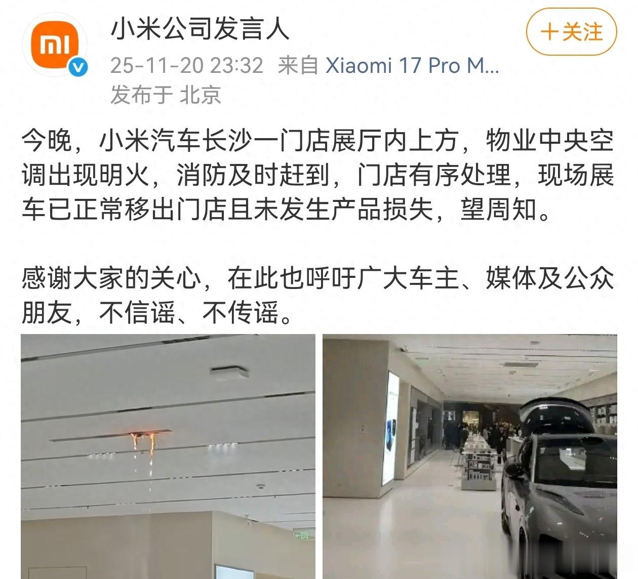 11月20日晚,长沙“步步高梅溪新天地”商场一楼的小米汽车展厅突发火情,相关视频迅速在网络传播,引发公众对火情原因及展车安全的关注。事件发酵后,小米方面率先作出回应,明确将起火原因指向“物业中央空调出现明火”,同时强调消防部门及时处置、门店有序应对,展车已正常移出且无产品损失,并呼吁公众不信谣不传谣。