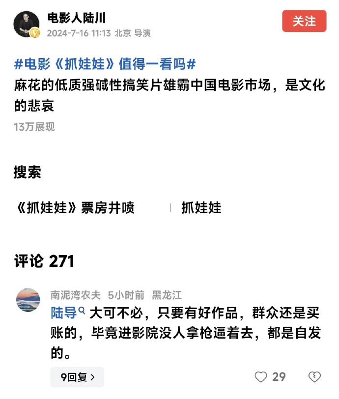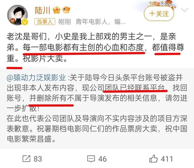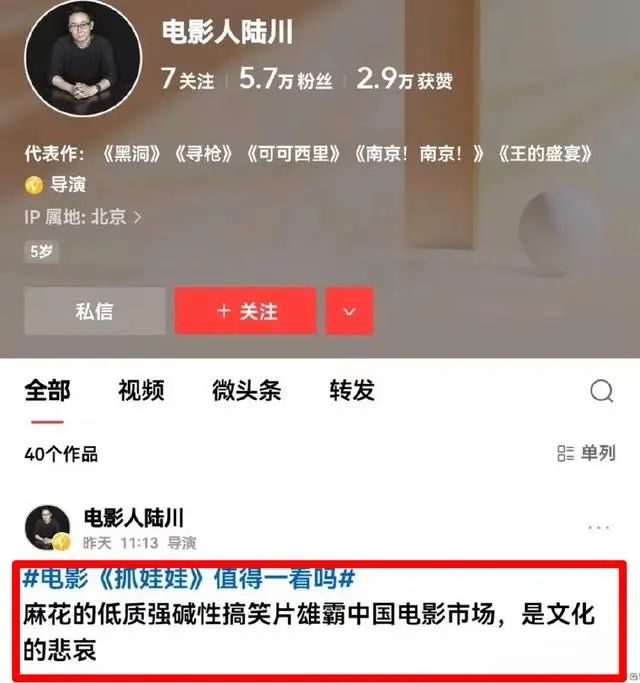 然而,就在这个时候,导演陆川却突然站出来发文评价这部电影,而且语言十分犀利。