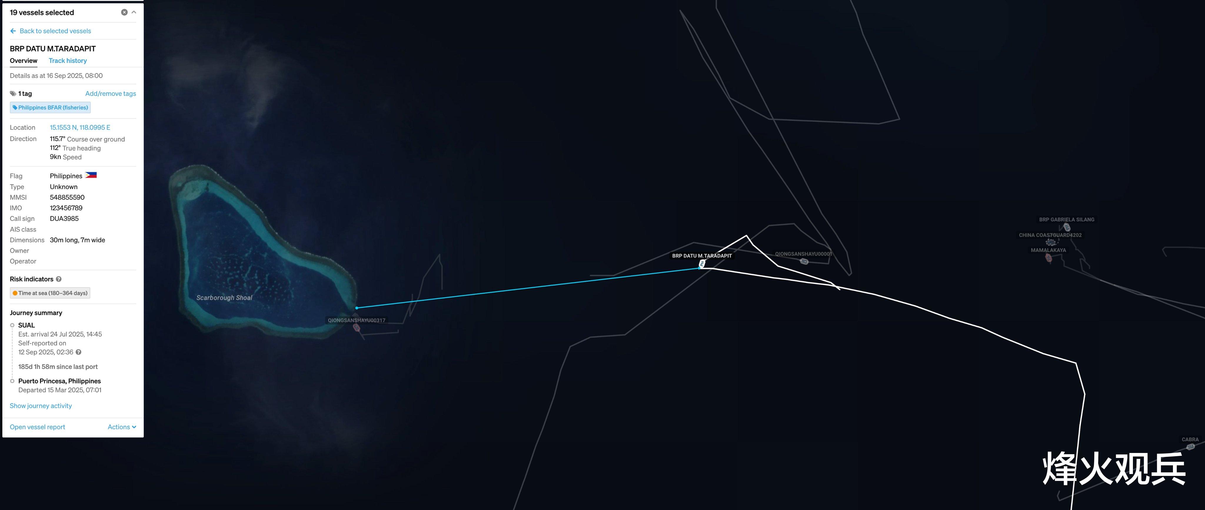 根据现场的画面以及相关信息我们可以得知,参与此次闯岛行为的菲律宾船只包括菲渔业与水产资源局的“马马拉卡亚”号渔业指导和运输船,“达图·M·塔拉达皮特”号渔业巡视船(MM0V-3006)和 “达图·罗玛佩内特”号渔业巡视船,菲律宾海岸警卫队“加布里埃拉·西朗”号 (OPV-8301) 、“卡布拉”号 (MRRV-4409)等。
