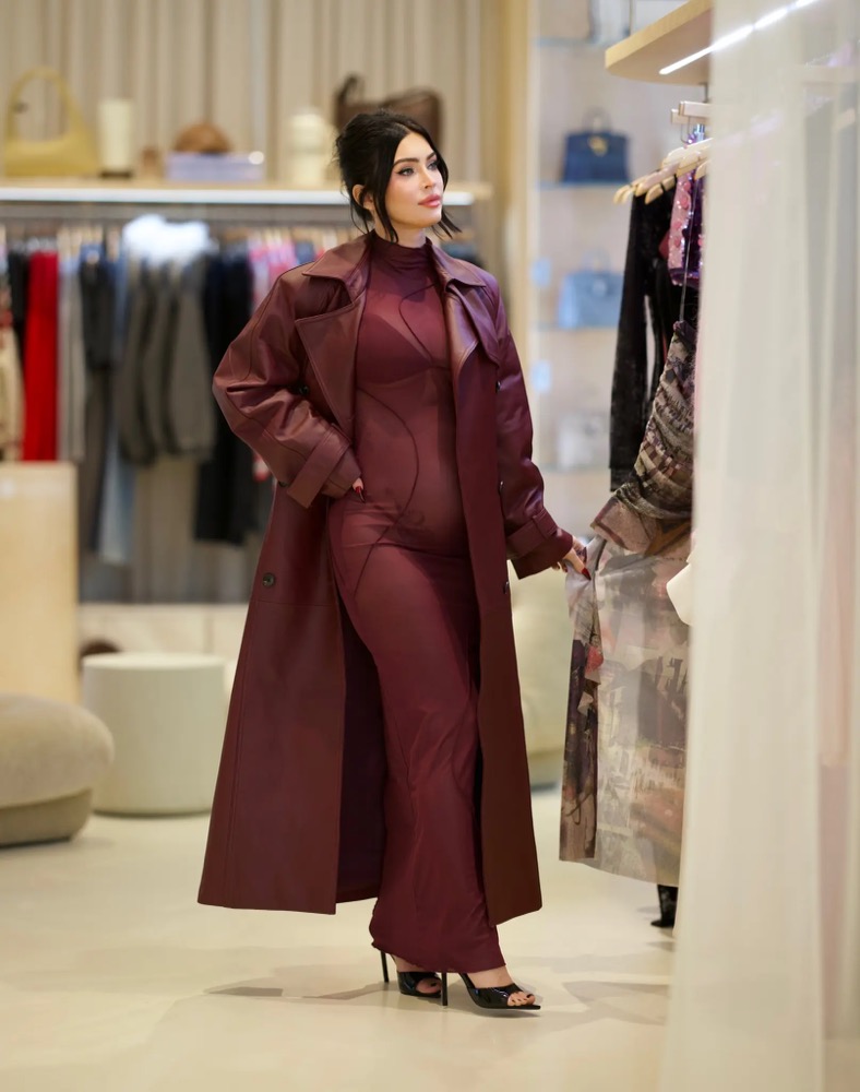 她还将深色的头发盘成了一个别致的扭转发髻,妆容在这次购物之旅中也显得较为淡雅。