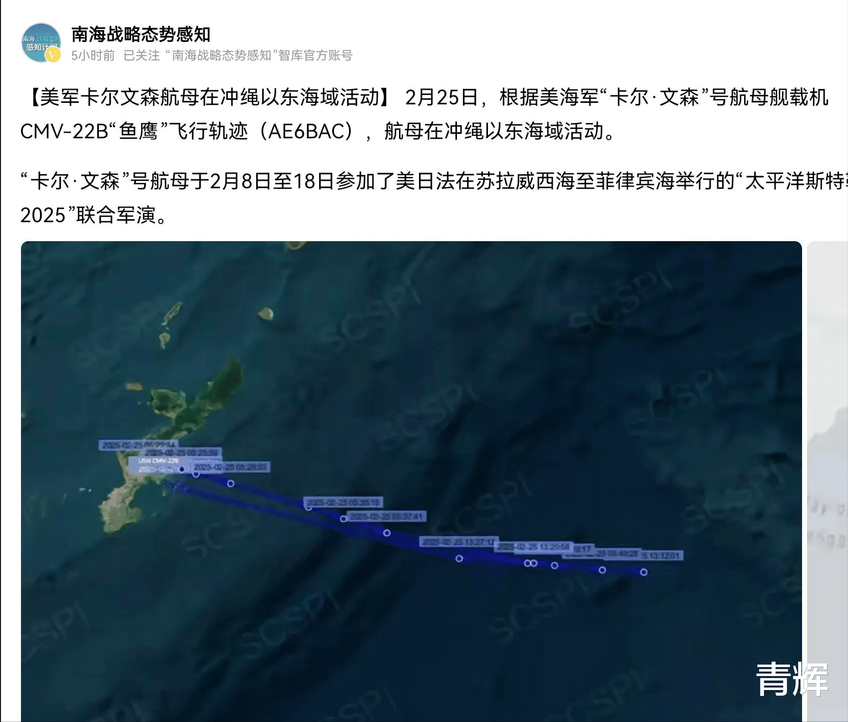 首先是演习结束之后,美国的卡尔文森号航空母舰并没有返回港口。截止到我们发稿之时,卡尔文森号航空母舰已经进入了冲绳海域。