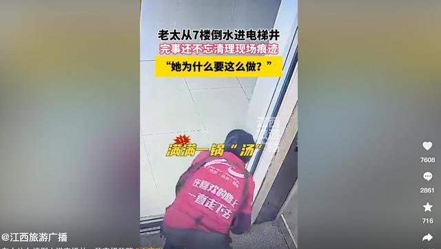 很多人看到这里肯定会以为这位老人想要下去吧,可事实却让所有人大跌眼镜——她居然把手里的一盆水小心翼翼的倒进了电梯井里!