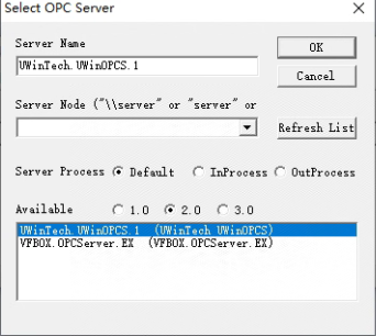 2. 点击菜单中的“OPC-connect”,可以搜索处网络中可的opc da服务器,选中要连接的服务器名称。本例选中:UWinTech.UWinOPCS.1 (opc da服务器的名称)
