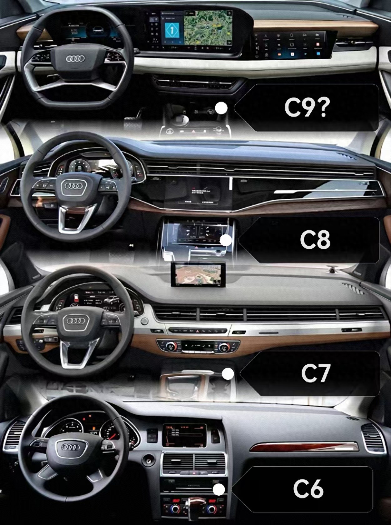 设计进化后,尾标革命:排量标识改为30FSI/40TFSI这种,这种设计给人较强的商务感,淡化“官车”色彩。内饰升级了:A8同款电动翻转屏+全液晶仪表盘,科技感跃升。折叠屏真是它的经典之处,但是也是故障率比较高的地方。C7的底盘开着是最舒服的,支撑、过坑过坎、紧实和精准度等等,相当赞。再加上首次引入四轮转向技术,转弯半径缩小至11.8米。