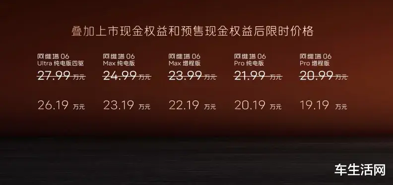 4月19日晚,阿维塔品牌第四款车型阿维塔06正式上市,共5款配置,官方指导价20.99万-27.99万元,叠加限时权益后门槛下探至19.19万元起,即日起开启交付。