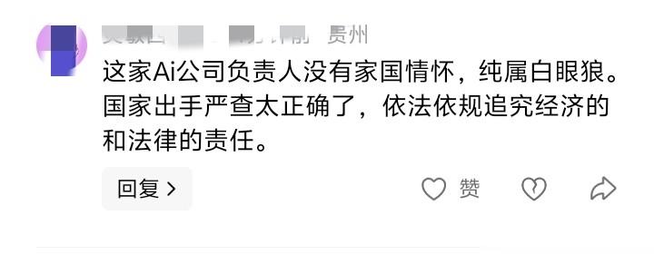 有网友痛斥这家AI公司负责人缺乏家国情怀,他说:“这家Ai公司负责人没有家国情怀,纯属白眼狼。国家出手严查太正确了,依法依规追究经济的和法律的责任。”
