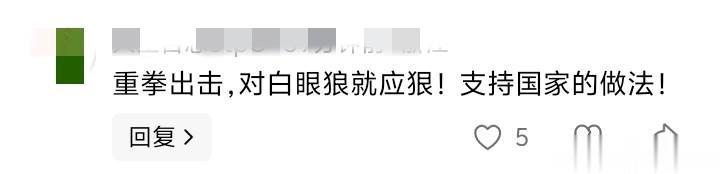 还有网友支持国家重拳出击,他说:“重拳出击,对白眼狼就应狠!支持国家的做法!”