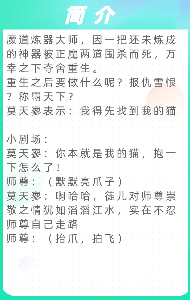 短评:男一曾经是个威名远扬的魔道炼器大师,但因为一个还没有练成功的神器被正魔两道以莫须有的罪名围剿而死,这个情节莫名的想到了魏无羡。万幸的是他没有死,而是重生了,重活一世他不想报仇,也不想称霸天下,只想找回那只心爱的小猫,过上简单温馨的生活。