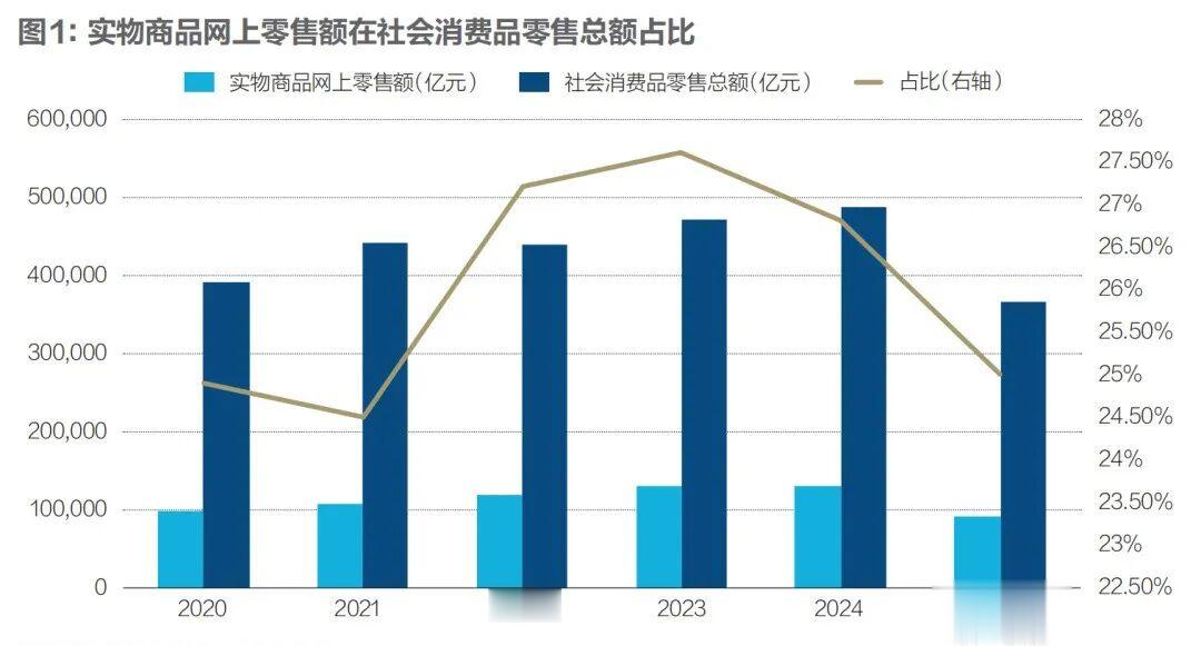 据国家统计局数据,2020至2024年间,中国实物商品网上零售额虽从9.759万亿元增至13万亿元,但同比增幅已从14.8%显著放缓至0.49%。同时,其占社会消费品零售总额的比重也已见顶回落。