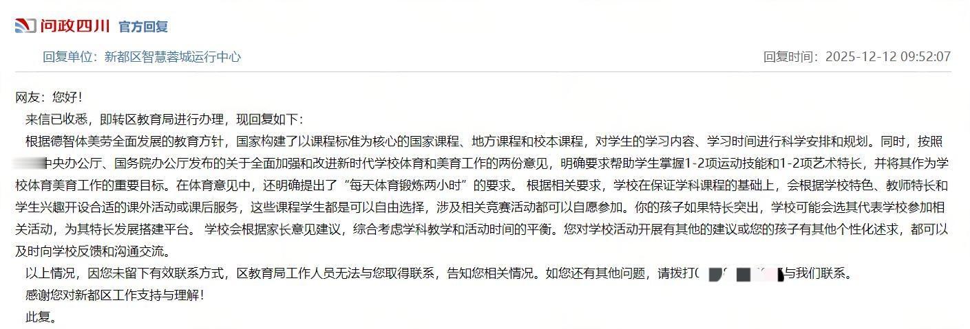 针对该留言,新都区教育局回应称: