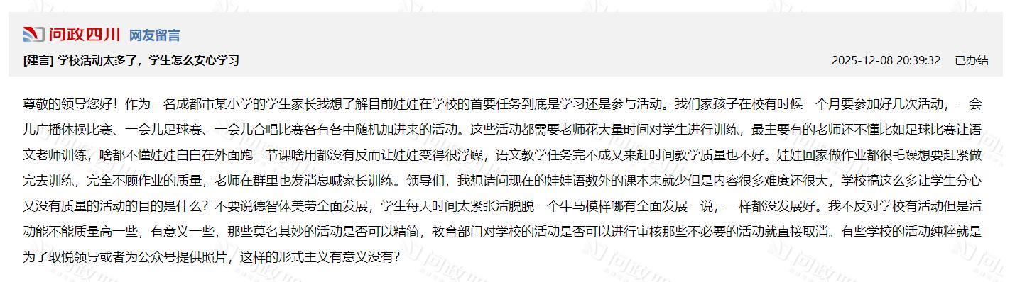 近日,网友在问政平台上留言,反映现在学校的活动太多了,担心会影响孩子的学习。