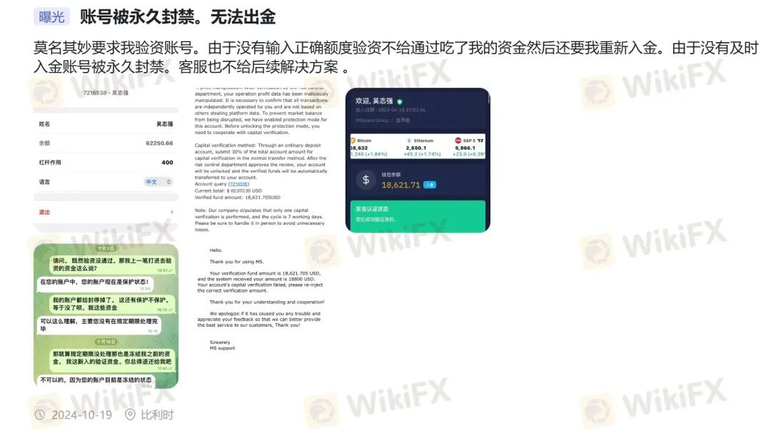 强哥去年的遭遇,黑平台把“温水煮青蛙”的套路演到极致。2024年10月,他在Msquare开户后,发现账户净值像被按了“暂停键”——操作再勤,钱就是不涨。等他想提现6.2万美金本金时,平台突然“变脸”:“监测到可疑交易,账户冻结!”接着甩来“解决方案”:交账户30%的“验资费”(约1.86万美金),验完就退。