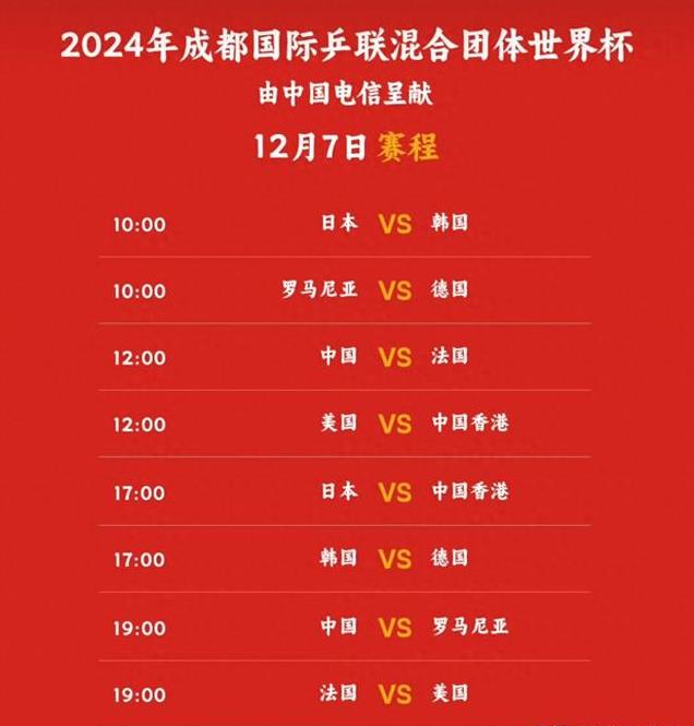 北京时间12月7日,成都混合团体世界杯中国队迎来第二阶段小组赛第五和第六个对手,分别是法国队和罗马尼亚队。CCTV5和CCTV5+分三个时段直播比赛。CCTV5将在中午12:00和晚上19:00直播中国队与法国队以及中国队与罗马尼亚队的比赛,而CCTV5+则在下午17:00直播日本与中国香港队的比赛。其他场次比赛大家可以在央视频APP上观看。具体赛程和对阵如下: