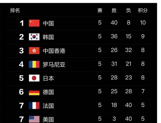 目前第二阶段循环赛四轮战罢,加上第一阶段小组赛带入的成绩中国队目前排第一名积分为10,其次是韩国队积分9排第二,中国香港积分为8排第三,罗马尼亚8分第4四日本8分第五,德国7分第六,法国和美国都是5分,排第七和第八。