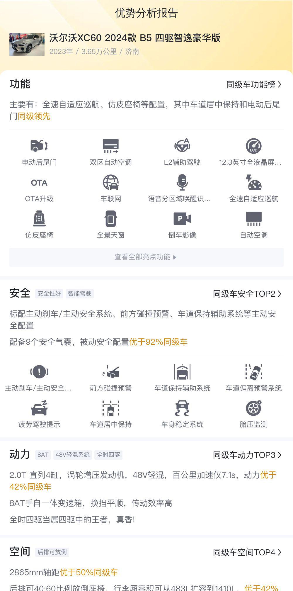再来看配置。这辆XC60配备了全速自适应巡航、仿皮座椅、车道居中保持、电动后尾门等功能,这些配置在同级别车型中也算是比较主流的。然而,对于一辆二手车来说,仅仅看配置清单是不够的。我们需要关注的是这些配置的实际使用情况。例如,自适应巡航是否灵敏,座椅是否存在磨损或老化,电动后备箱是否能够正常工作等等。此外,卖家还建议升级L2辅助驾驶和手机APP远程控制,但这意味着额外的费用支出。我们需要权衡这些升级的必要性和性价比,是否真的符合我们的实际需求。