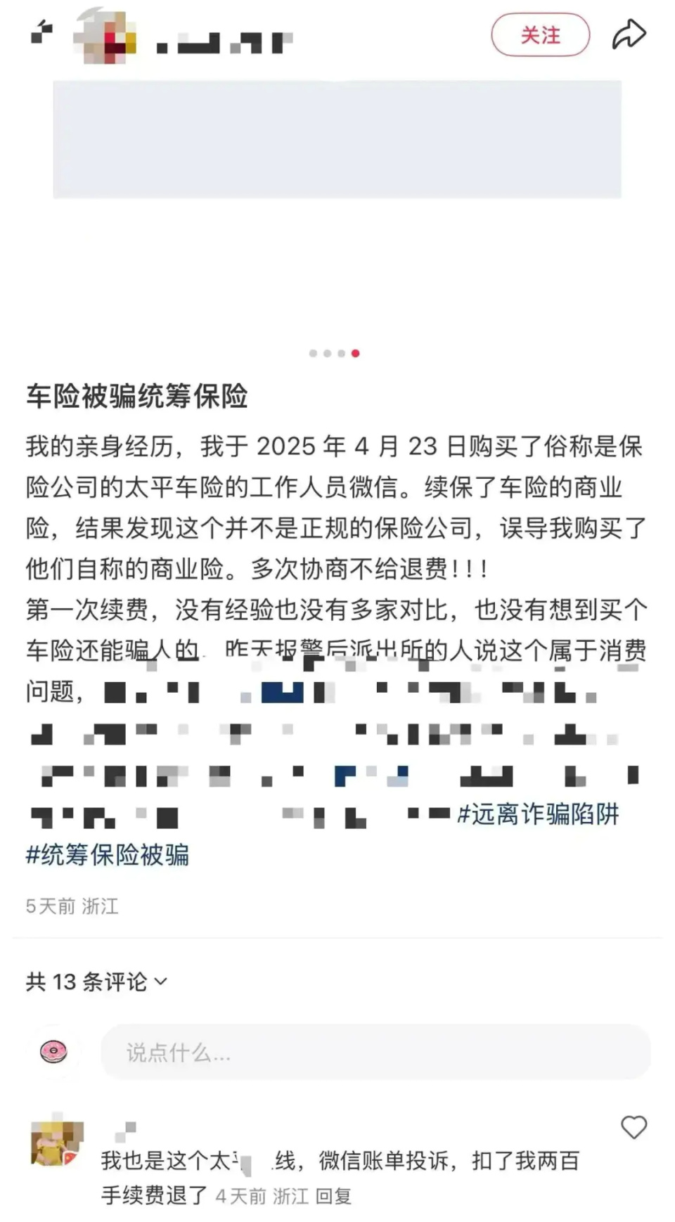 “比市场价便宜近千元”是这类骗局的核心诱饵。骗子利用消费者比价心理,将统筹险包装成“保险公司让利活动”。山东于先生被“泰康保险”低价吸引付款后,合同却变成“泰康(海南)汽车服务有限公司”,退款时被强行扣除20%手续费。社交媒体上大量受害者表示,低价背后是赔付时“找不到人”“公司已注销”的深渊。