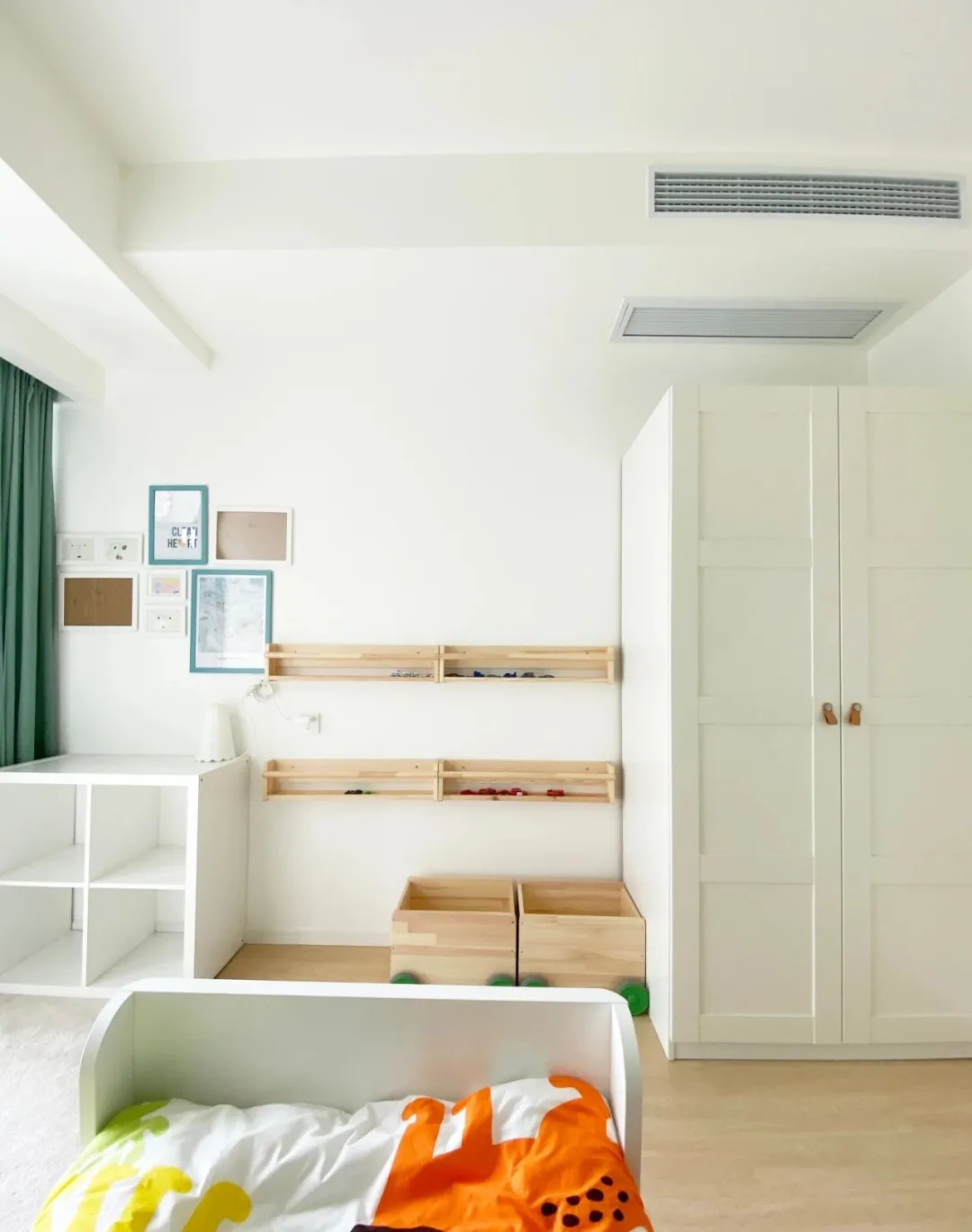 儿童房注重灵活多变,可调节的床铺与书桌契合孩子不同成长阶段需求,全挂的衣柜设计还能助力培养孩子的独立能力。