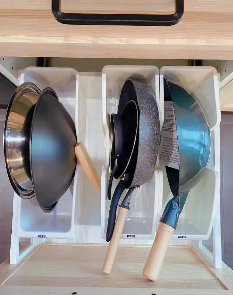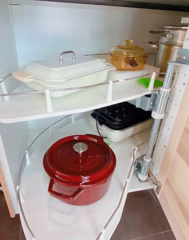 文件盒、转角拉篮等收纳神器,更是将锅具、餐具安排得井井有条。