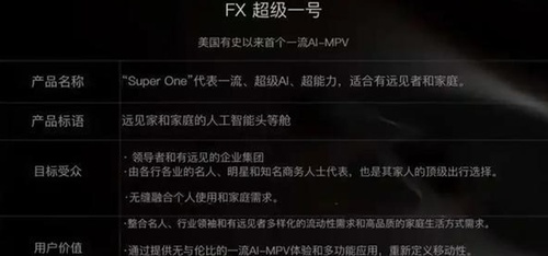 FX官方对这款车啊,那可是寄予了厚望。表示FX Super One在空间、舒适、豪华、人工智能、互联网应用层面都更有特点。目标用户呢,是亚洲顶级企业家、名人和富裕家庭。这就意味着,这款车得在各个方面都做到极致才行啊。就好比一场高端晚宴,每一个细节都不能出错,得让那些贵客们都挑不出毛病来。