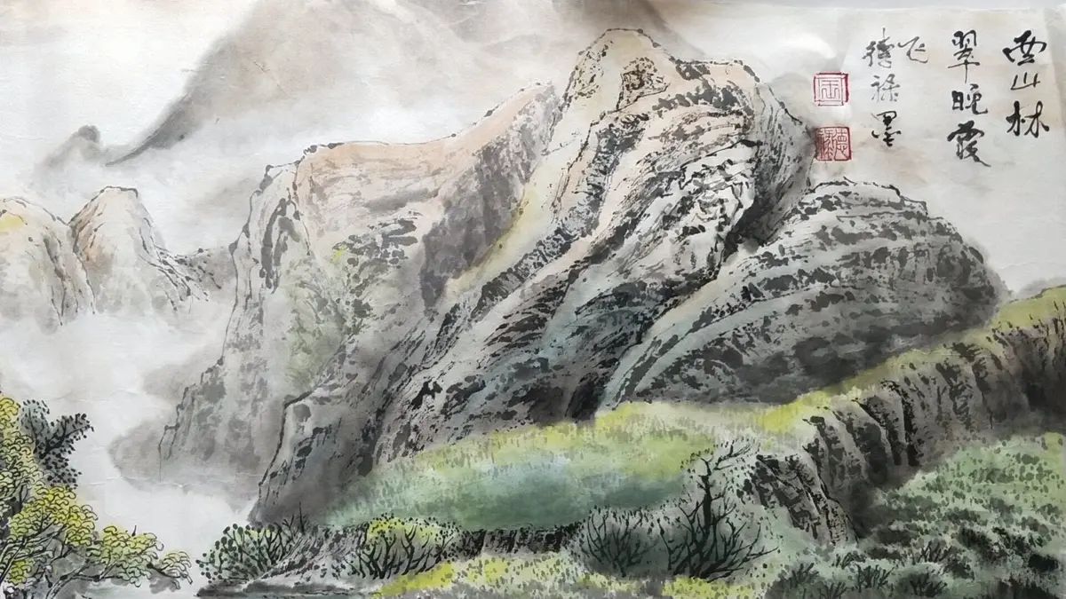 石绿(春/夏):调极淡汁绿(花青+藤黄)罩染阳面,山阴略染赭石。