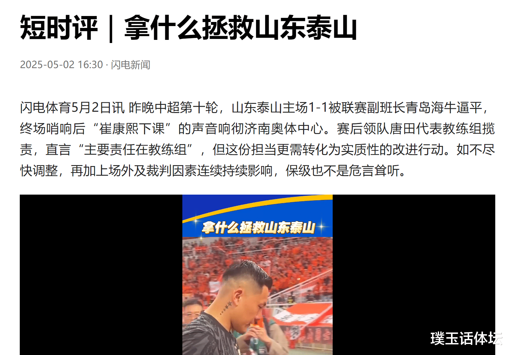 鉴于泰山队当前的情况山东官媒闪电新闻也发布了《拿什么拯救山东泰山》的文章,并点评。文章指出泰山教练组的战术布置暴露出明显短板,教练组“传中-抢点”的单一战术套路被对手彻底摸透。泰山压顶需弯腰破局,困守旧辙救不了泰山队。教练组的所谓“担责”也不能仅仅是表态,不下课那就刀刃向内的勇敢变革。