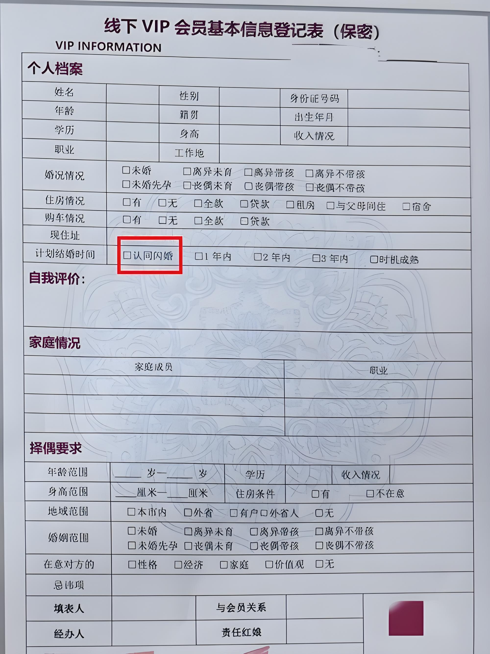 为了让记者尽快做出决定,杨女士向南都记者提供的会员基本信息登记表中,计划结婚时间包含了 “认同闪婚” 的选项。她还信誓旦旦地表示,前期会进行层层把关,过滤掉不适合的男性人选,在此基础上,约会见面的人成功率就很高,很多人来这边不用见太多,有些人 1 个月就能恋爱。这种将 “闪婚” 作为选项的做法,无疑是在暗示单身人士,认同闪婚才能更快地找到对象,解决婚恋问题,从而将 “认同闪婚” 塑造成为一种似乎是必要的选择,加剧了单身群体的焦虑感。
