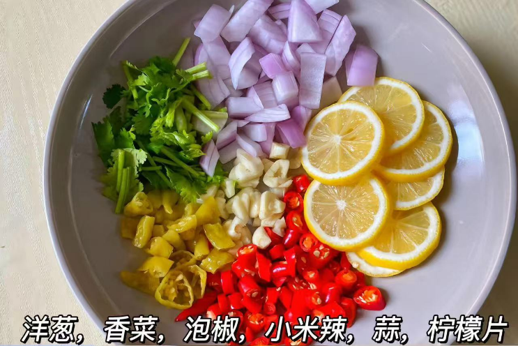 - 辅料:柠檬 1 - 2 个、小米辣 3 - 5 个(可根据吃辣程度调整)、大蒜 3 - 4 瓣、生姜 1 块、香菜 2 - 3 根、洋葱1个、小葱 1 棵、泡椒2个