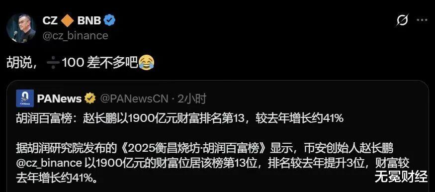 据胡润研究院10月29日发布的2024“胡润百富榜”显示,48岁的赵长鹏的个人财富仍逆势增长900亿元,以1900亿元的财富位列第13位。不过,赵长鹏对这一数据表示否认,声称这个数字要除以100。
