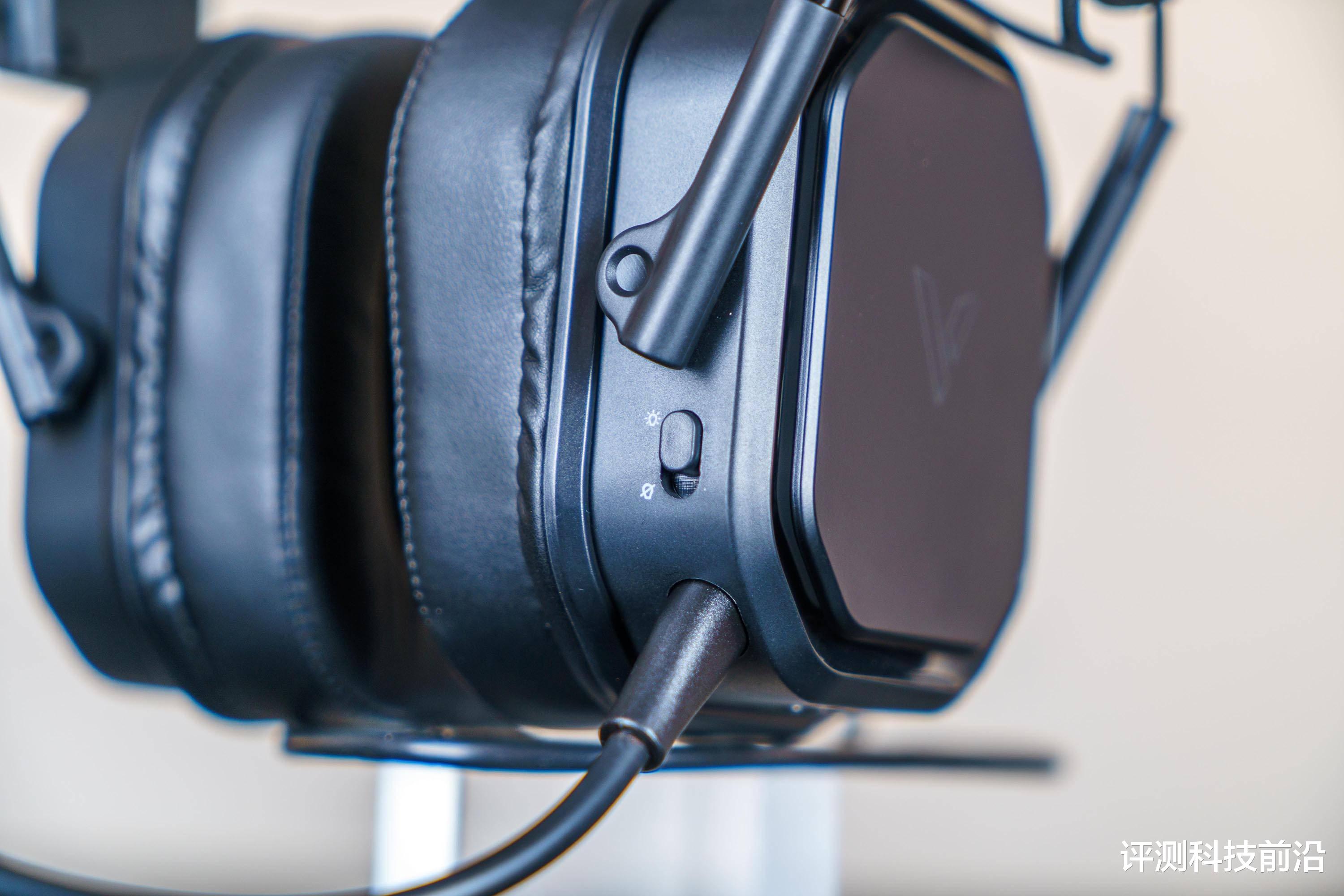 ▼耳机头梁上烫印了大大的雷柏LOGO,皮质的质感还行;从耳机底部可以看到,左声道上还有一个AUX的音频输入接口和一个type-c的充电接口,可惜这个C口不支持数字音频输入