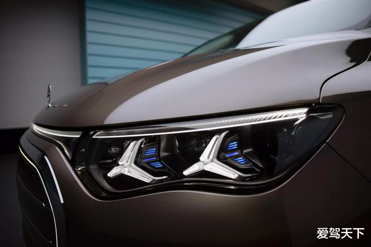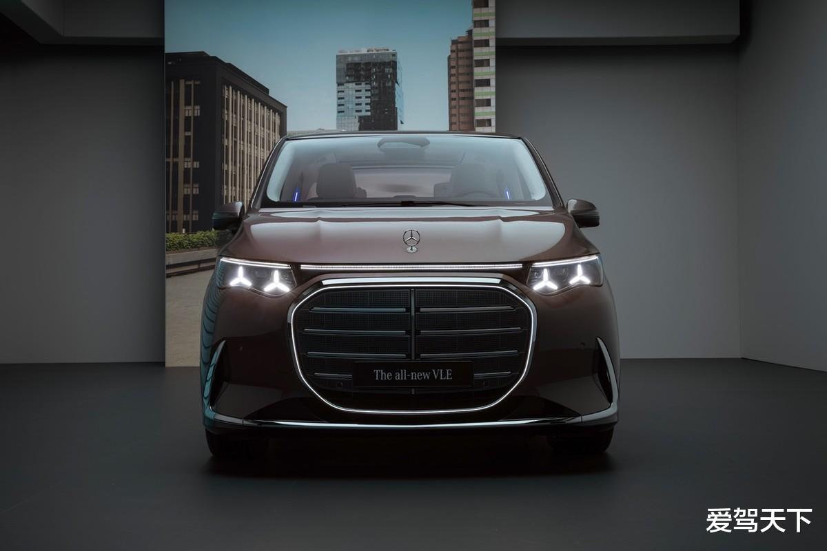 先来看看这套注定褒贬不一的外观。相比此前发布的Vision V概念车,量产版VLE收敛了不少。前脸依旧保留了奔驰家族最爱的大嘴式格栅,搭配发光灯带、镀铬饰条,以及三叉星徽元素的大灯,谈不上多好看,但确实够显眼。此外,奔驰VLE提供两种前脸套件,主要区别在于车标位置和前包围造型。