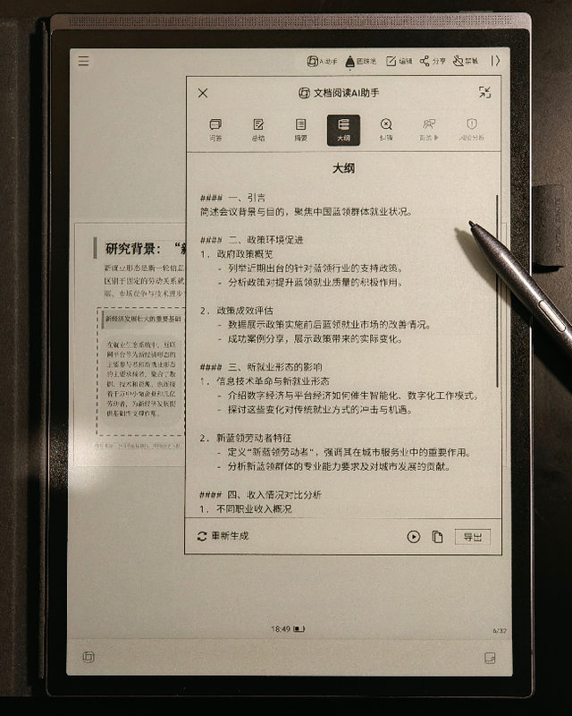 在X3上,可以先用AI读一遍,自动生成总结、摘要和大纲。这样一来,上百页的文档,你几十秒就能拎出关键信息点。有想深入了解的地方,还可以直接向AI提问,让它根据文件回答。